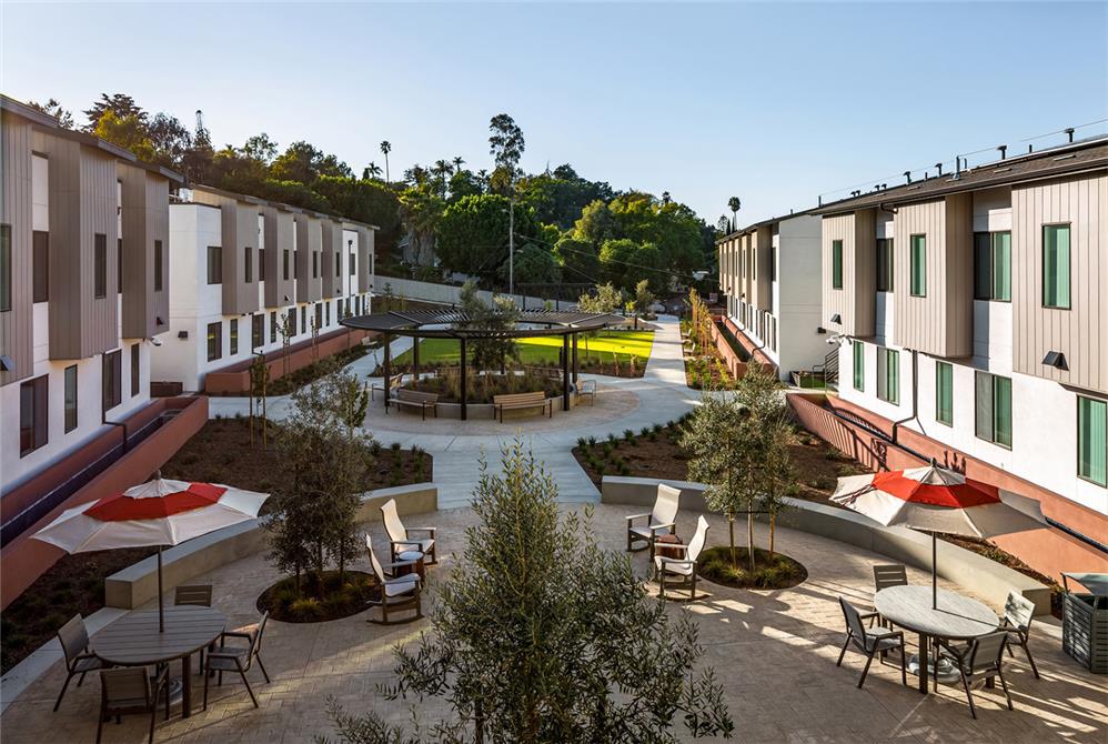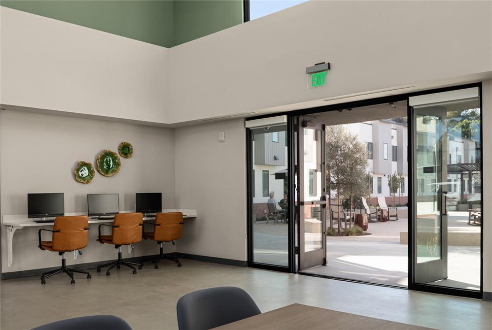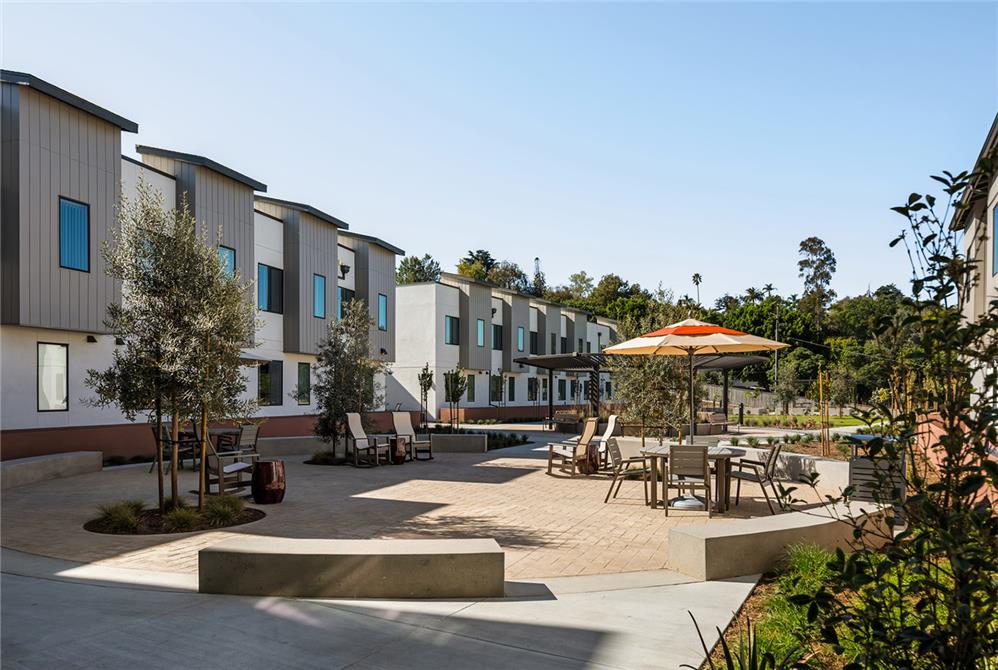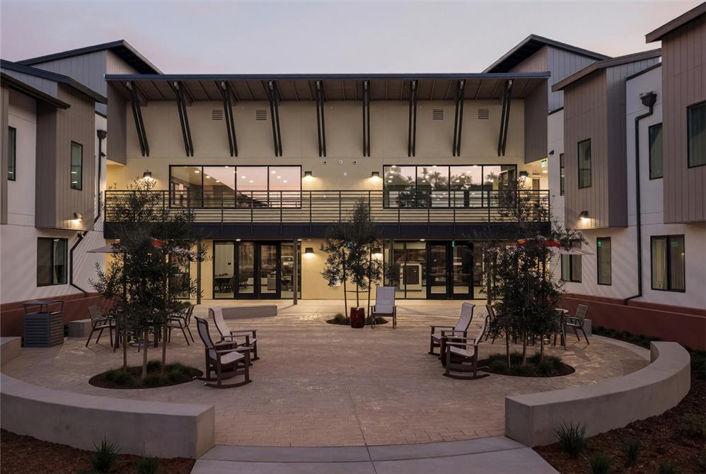 A shaded trellis, community gathering spaces, and social stair bridges create opportunities for interaction while supporting intuitive circulation throughout the site. Thoughtfully integrated bay-window elements add rhythm to the building façade and bring light and views into individual residences.