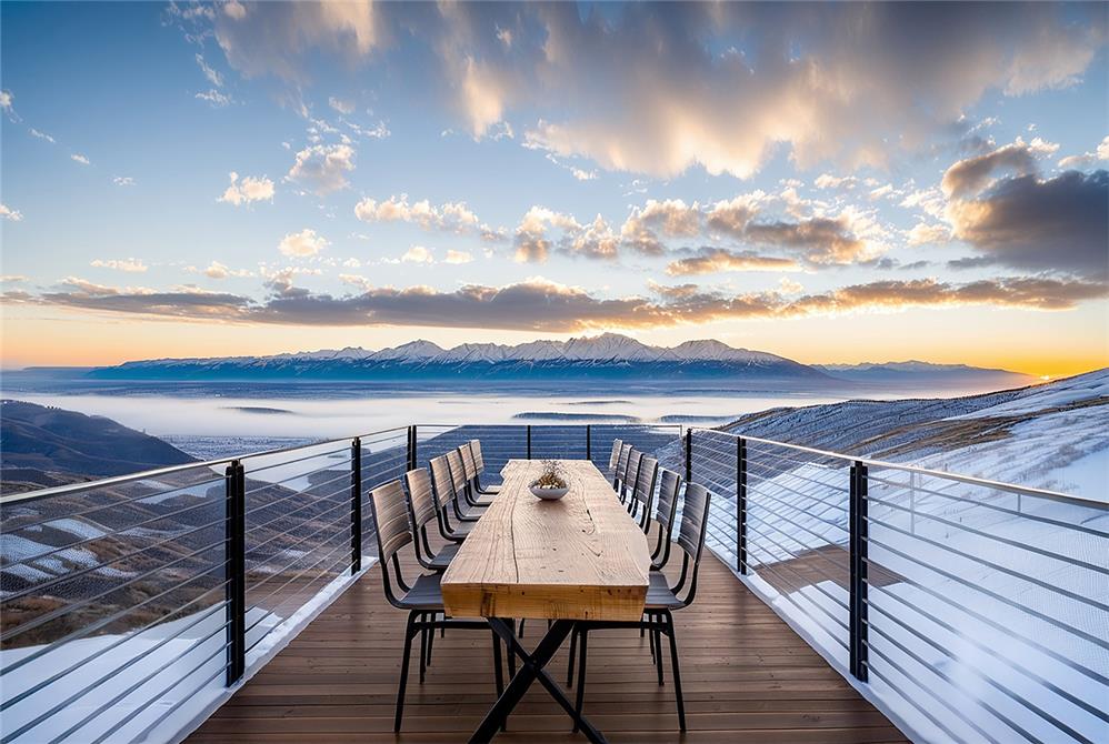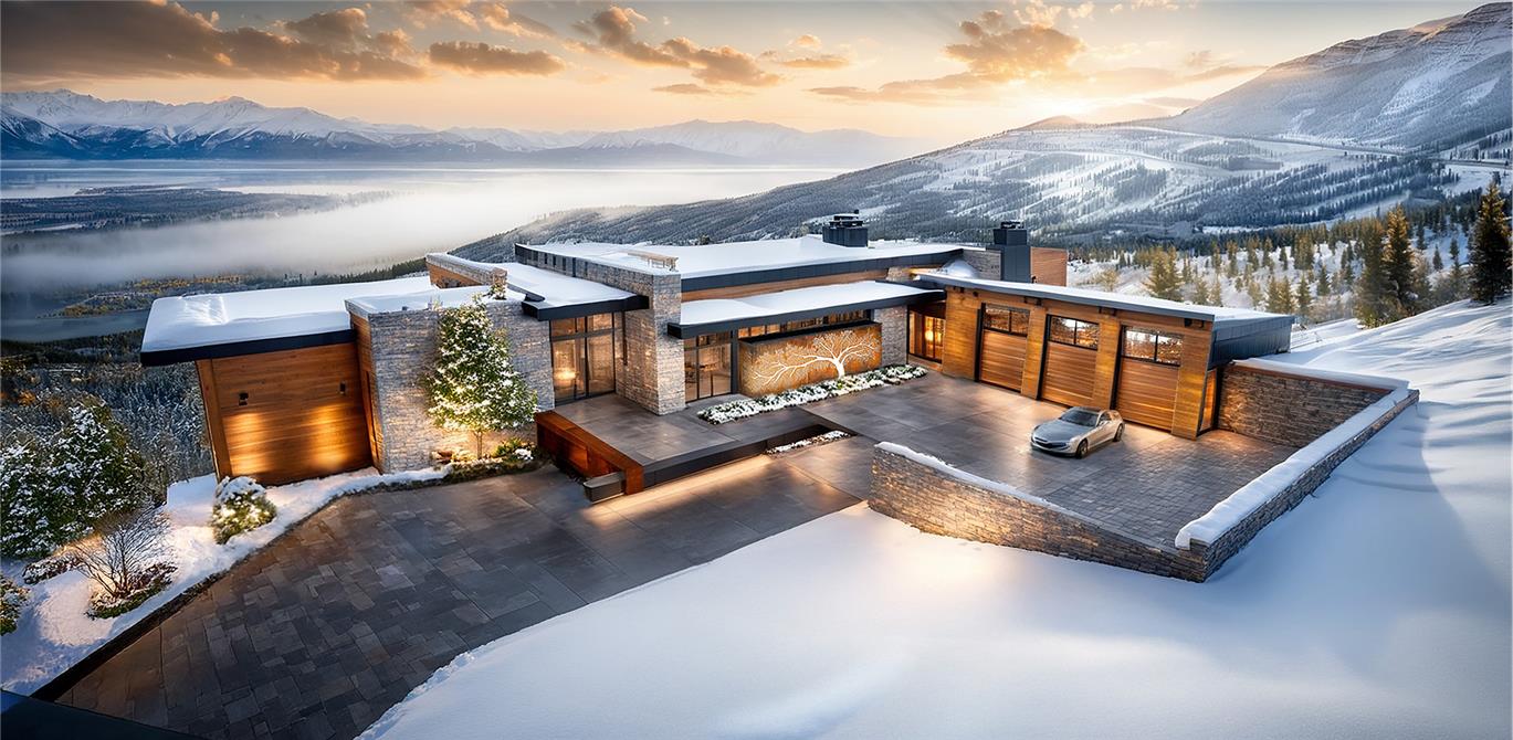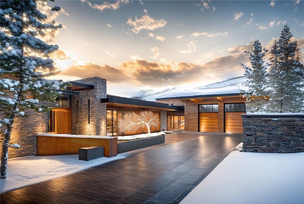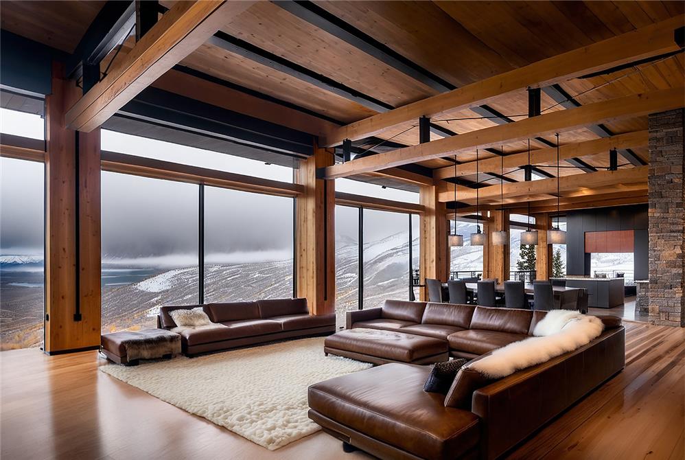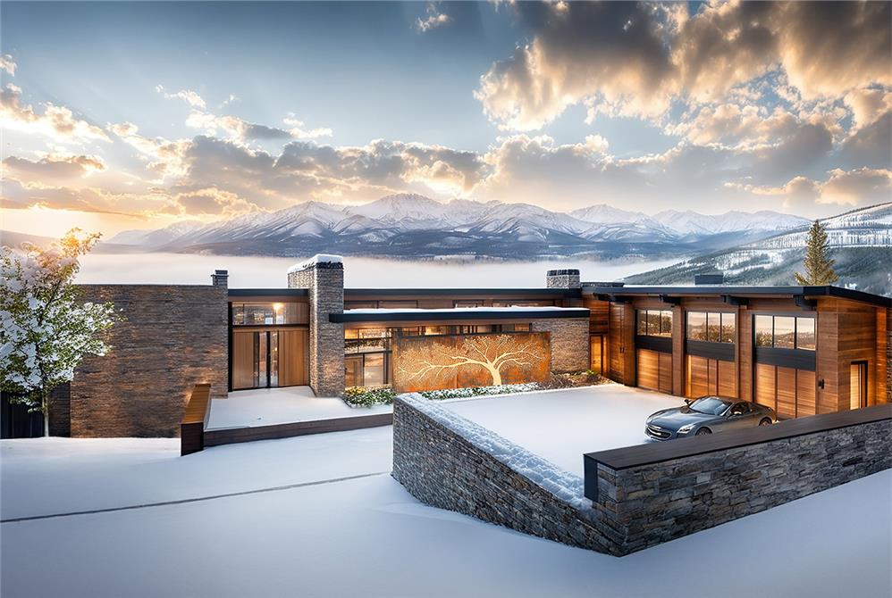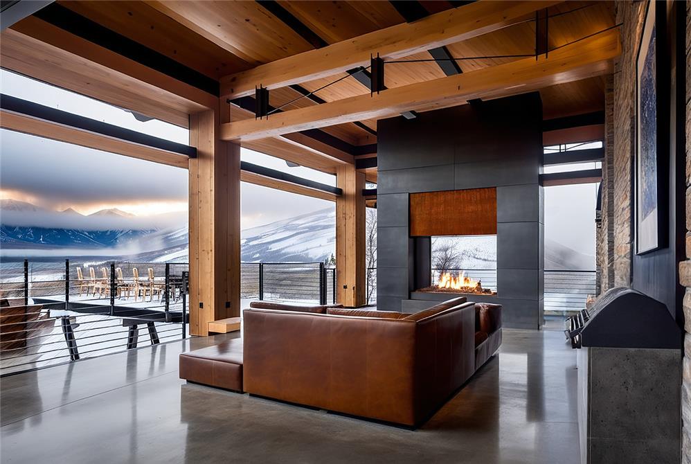 Nestled into the slope, the home’s placement maximizes daylight and panoramic views while minimizing its visual impact on the landscape. The architecture follows the natural contours of the site, creating a grounded presence that feels both secluded and open. Floor-to-ceiling and corner windows frame unobstructed views of the surrounding mountains and ski resorts, while the home’s position within the vale provides a private perspective of the Painted Valley Golf Course.