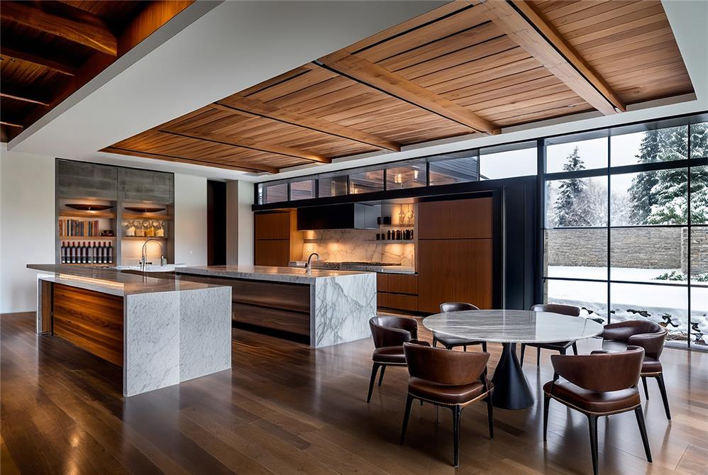 Designed for family living and year-round entertaining, the residence features five bedrooms, generous gathering spaces, and amenities including a wellness center, sauna, game room, private study, and a cantilevered overlook set within the trees. Natural materials, expansive glazing, and strong indoor-outdoor connections define the home’s character, resulting in a refined yet welcoming retreat where architecture, art, and landscape are seamlessly integrated.