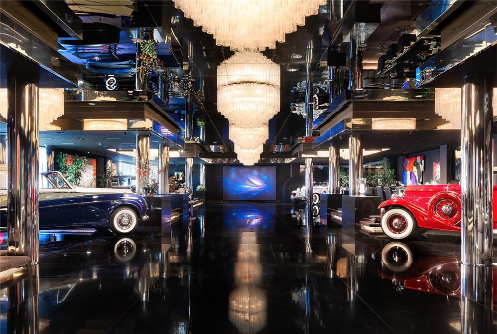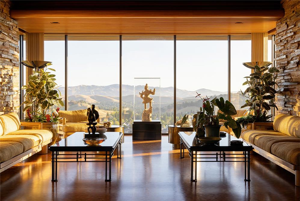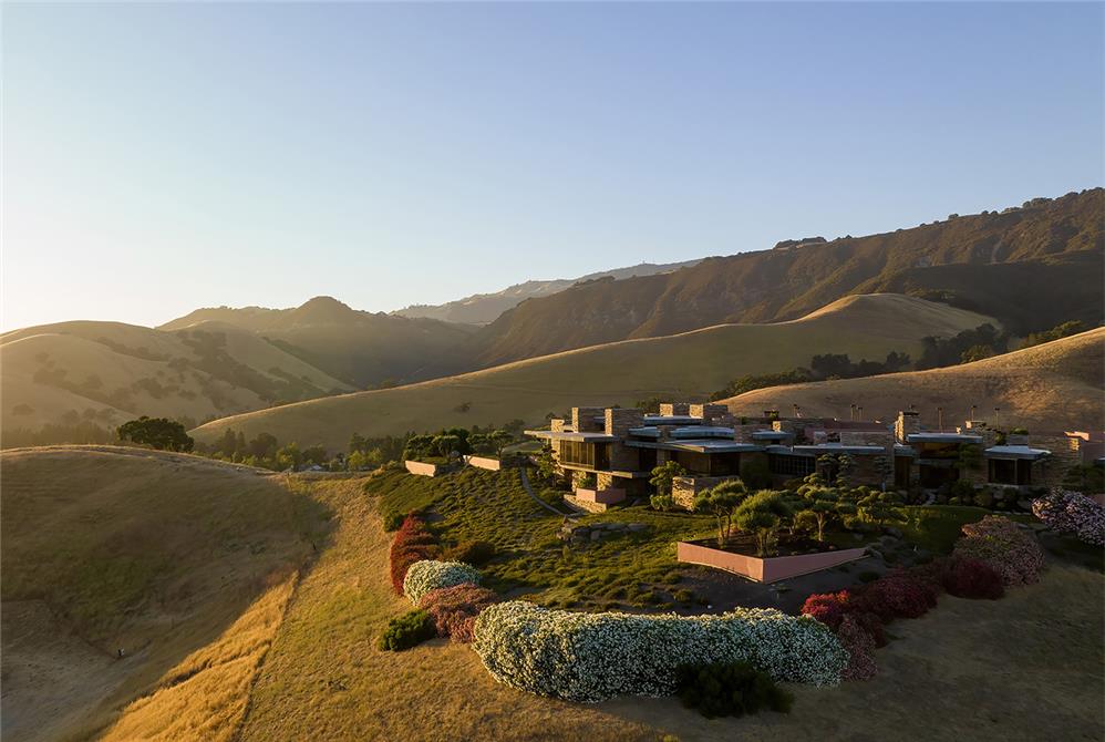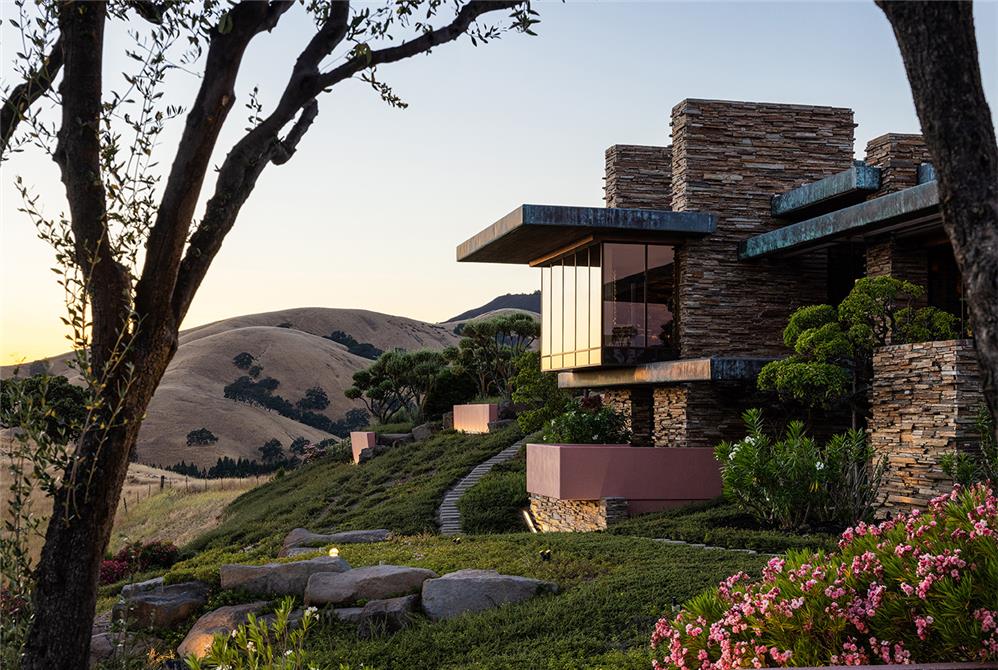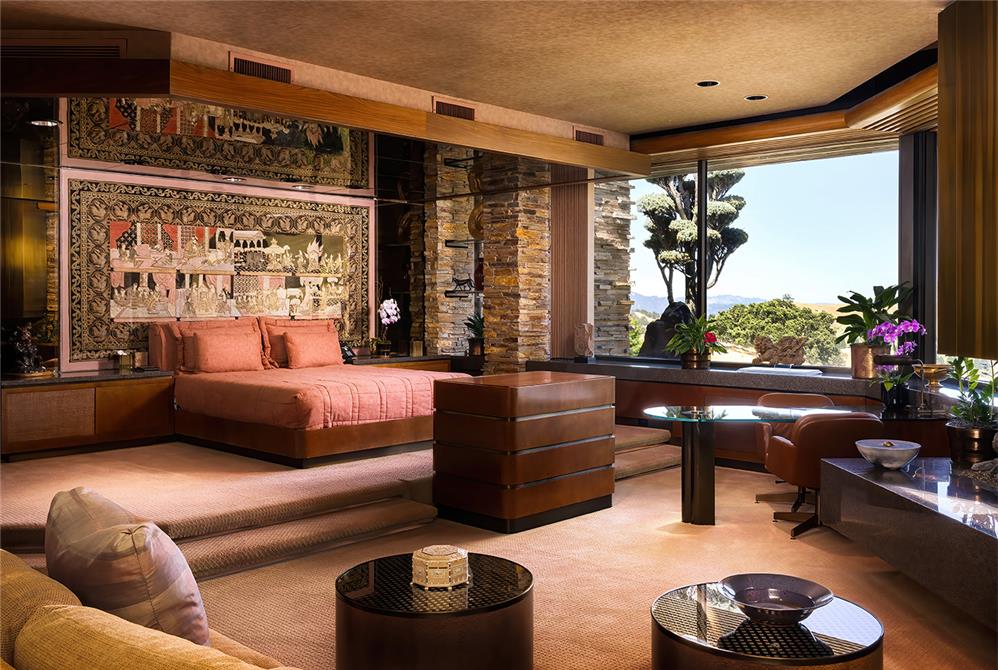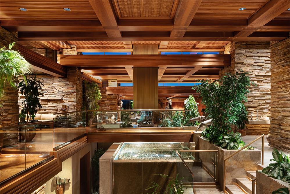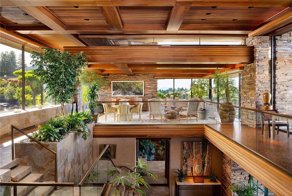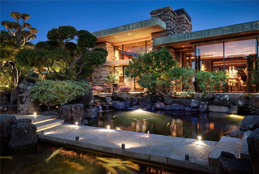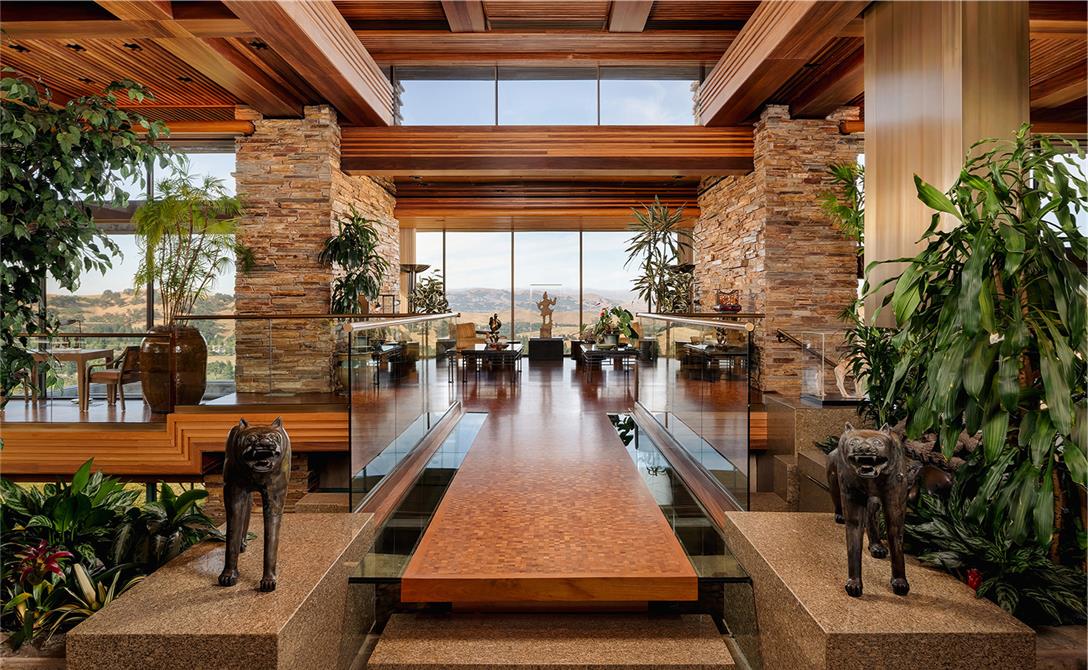Inside and outside materials flow together as the living spaces are organized around a two-story atrium. The home embraces its site with two courtyard gardens, surrounded entirely by its main living areas. These gardens include cascading pools, koi ponds and waterfalls. A skylit breezeway features kitchen, barbecue and bar, and links the courtyard garden to a tennis court built atop the 7,000-square-foot semi-subterranean ballroom. Despite its expansive size, the design emphasizes intimacy and warmth.