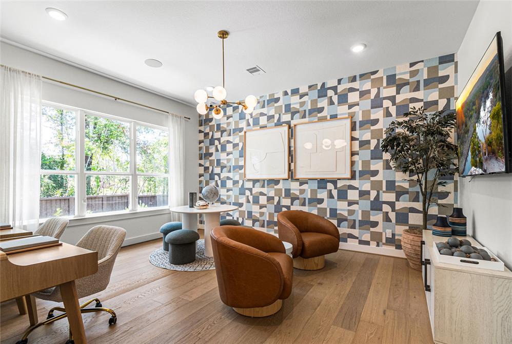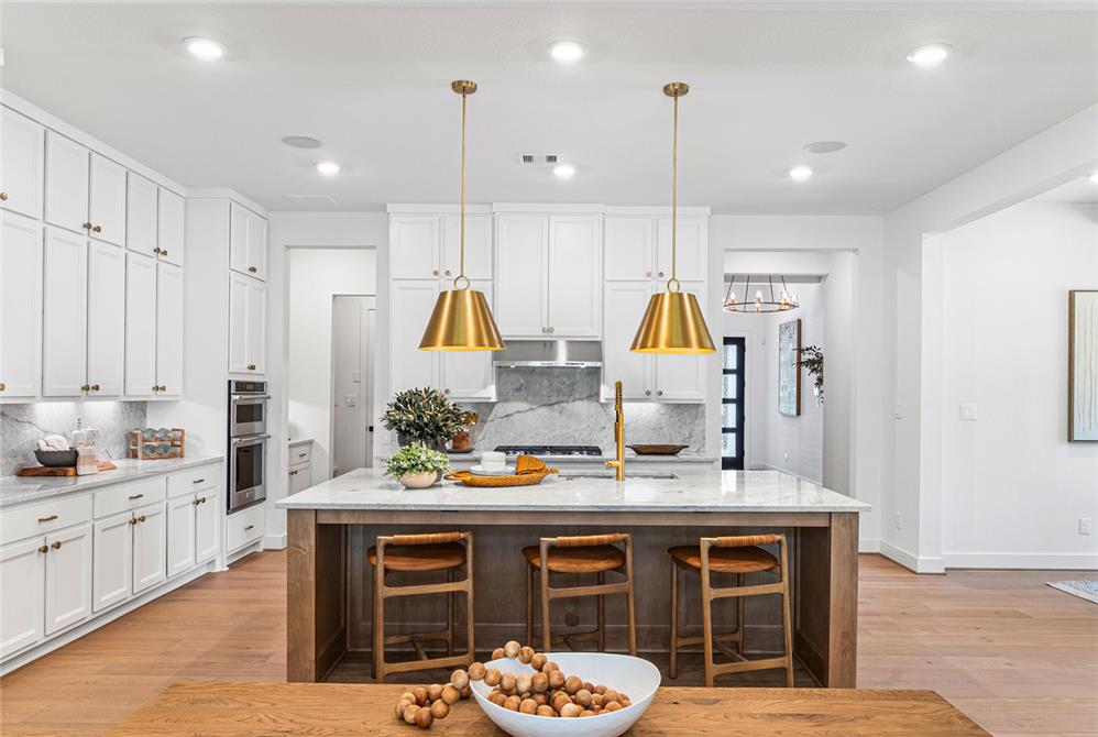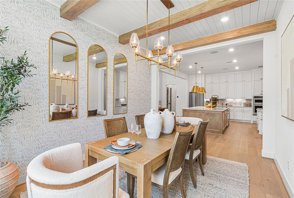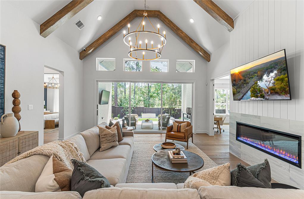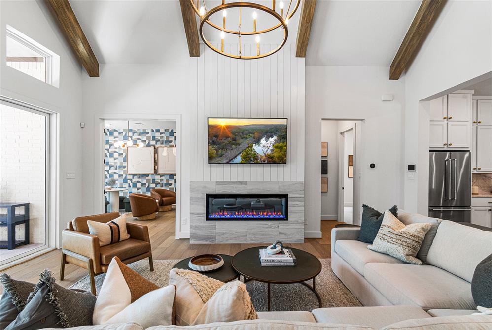DAHLIN provided interior design for the Fenton Classic model, shaping a warm, livable environment that reflects both the scale of the home and its natural surroundings. The interiors balance openness and comfort, with living, dining, and kitchen spaces flowing together under high ceilings and exposed wood elements. A soft, neutral palette is paired with warm wood tones, tailored millwork, and moments of pattern and color to create depth without overwhelming the space.